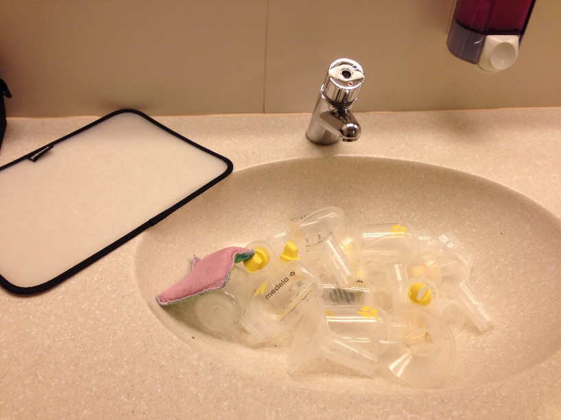Washing parts in the bathroom at Geneva Airport after pumping three times on an overnight flight from the States, October 2014.